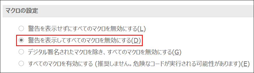 [マクロの設定]をクリックし、「警告を表示してすべてのマクロを無効にする」をクリックします。
